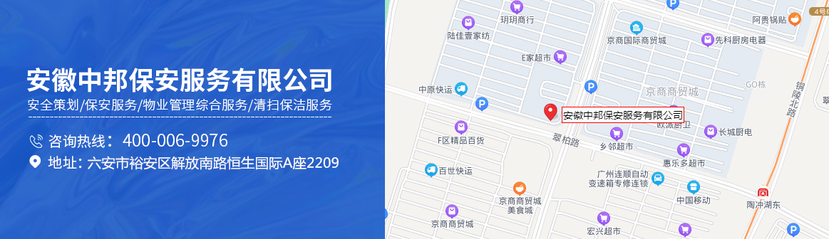 中邦服務(wù)簡(jiǎn)介 安徽中邦保安服務(wù)有限公司總公司成立于2019年。公司 成立以來,始終以“文明值勤、優(yōu)良服務(wù)、客戶至上、安全為先” 為宗旨,以保一方平安為已任,面向社會(huì)各界等提供有償保安護(hù) 衛(wèi)、技術(shù)防范、保安培訓(xùn),是一家專業(yè)化保安服務(wù)公司。目前, 公司下為200多家客戶單位提供周到安全的保安服務(wù),遍布全省 及周邊地區(qū),現(xiàn)有各類專業(yè)人員和保安員2000余名。 中邦服務(wù)宗旨 安徽中邦保安服務(wù)有限公司是為適...